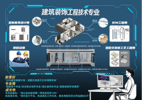 面向建筑装饰装修行业,精准对接建筑装饰设计公司、建筑装饰施工企业、建筑装饰造价咨询企业、建筑装饰监理咨询公司、房地产公司,围绕建筑装饰行业智能化、工业化、数字化的发展需要,培养“能设计、精施工、懂管理、会预算”的建筑装饰设计与施工管理类技术技能人才培养。