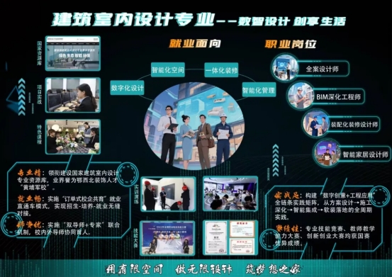 核心课程:室内设计基础、数智化住宅空间设计、BIM建模技术、全屋定制家具设计、公共空间设计、VR设计及应用、数字化软装设计、数字手绘表现技法、建筑装饰施工技术、室内施工图绘制与深化设计等。