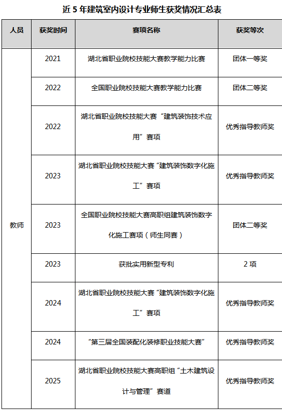 建筑室内设计专业拥有一只实践经验丰富、具备国际视野的校内专任教师和行业企业专家、设计师、项目经理构成的企业师傅组成的专兼结合“双导师”教学团队。团队成员中“双师”素质教师达100%,名师工作室主持人2名,国家级、省级精品课程负责人5名。教师团队获得全国职业院校教学能力大赛二等奖、全国职业院校信息化教学大赛三等奖、湖北省教育厅“信息化教学大赛”一等奖,参加全国职业院校“土木建筑设计与管理”赛道获金奖、“建筑装饰数字化施工”赛项获二等奖、中国国际“互联网+”大学生创新创业大赛获银奖。