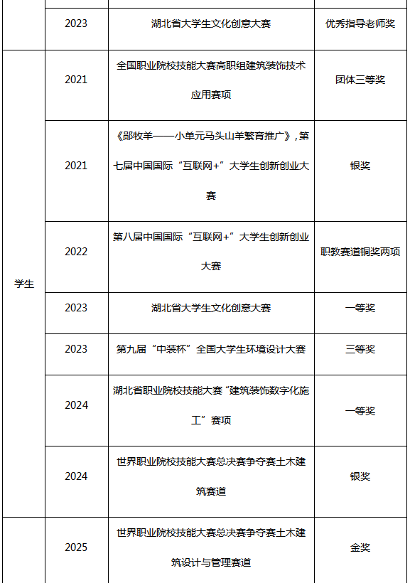 近三年共获省级教学成果奖两项,主持市级科研课题12项,发表论文30余篇,编写校本教材8门,建设精品课程8门,获批实用新型专利3项。团队参与襄阳新飞机场、襄阳恒大名都小区、碧桂园小区精装房设计、施工、项目管理等工程。